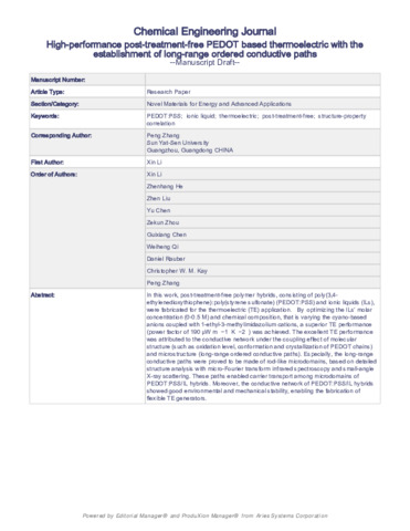 | Title: | High-performance post-treatment-free PEDOT based thermoelectric with the establishment of long-range ordered conductive paths |