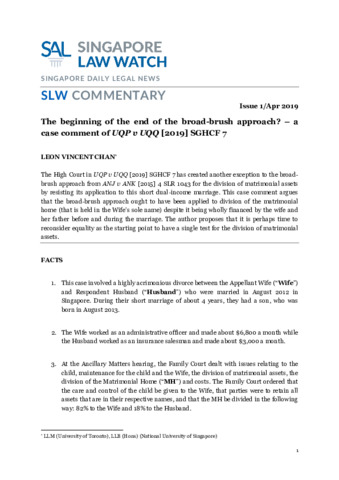 Title: | The Beginning of the End of the Broad-Brush Approach? – A Case Comment of UQP v UQQ [2019] SGHCF 7 (April 2019). Singapore Law Watch Commentary (Issue 1 of Apr 2019) |