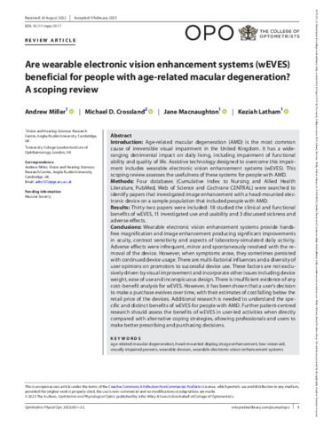 | Title: | Are wearable electronic vision enhancement systems (wEVES) beneficial for people with age-related macular degeneration? A scoping review |