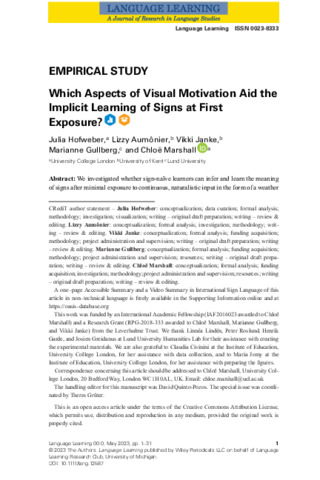 Title: | Which aspects of visual motivation aid the implicit learning of signs at first exposure? |