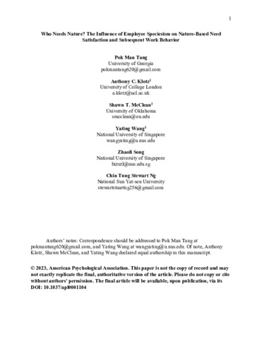 | Title: | Who needs nature? The influence of employee speciesism on nature-based need satisfaction and subsequent work behavior |