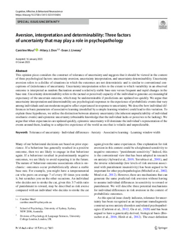Title: | Aversion, interpretation and determinability: Three factors of uncertainty that may play a role in psychopathology |