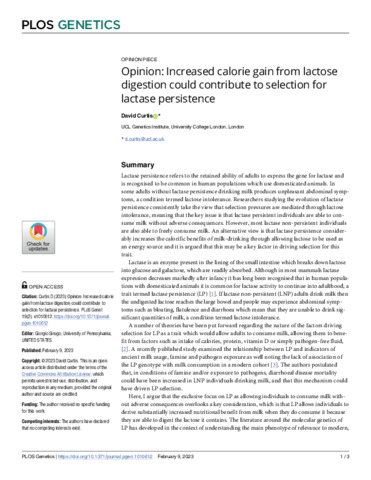 Title: | Opinion: Increased calorie gain from lactose digestion could contribute to selection for lactase persistence |
