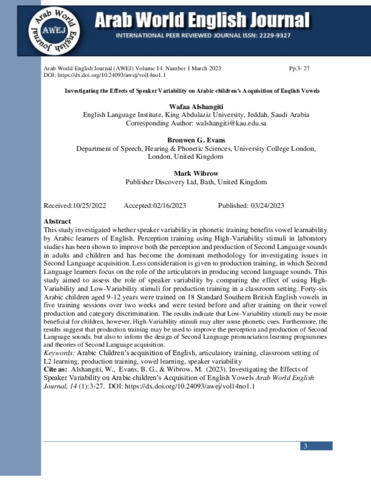 Title: | Investigating the Effects of Speaker Variability on Arabic children’s Acquisition of English Vowels |
