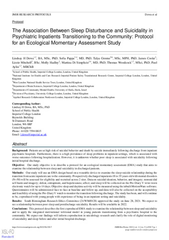 Title: | The Association Between Sleep Disturbance and Suicidality in Psychiatric Inpatients Transitioning to the Community: Protocol for an Ecological Momentary Assessment Study |