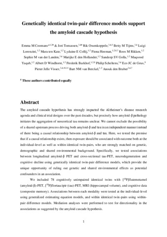 | Title: | Genetically identical twin-pair difference models support the amyloid cascade hypothesis |