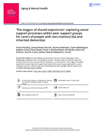| Title: | ‘The oxygen of shared experience’: exploring social support processes within peer support groups for carers of people with non-memory-led and inherited dementias |