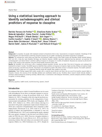 Title: | Using a statistical learning approach to identify sociodemographic and clinical predictors of response to clozapine |