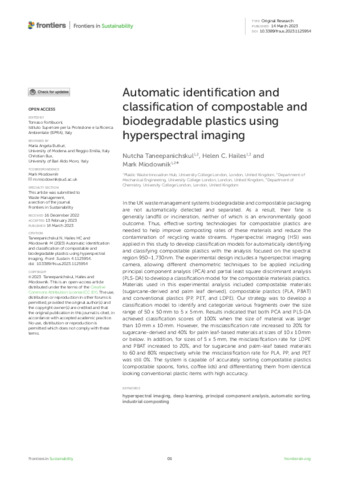 Title: | Automatic identification and classification of compostable and biodegradable plastics using hyperspectral imaging |