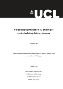 Title: | Vat photopolymerisation 3D printing of controlled drug delivery devices |