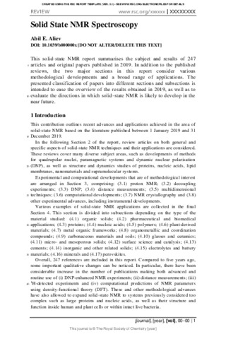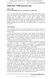 This solid-state NMR report summarises the subject and results of 247 articles and original papers published in 2019. In addition to the published reviews, the two major sections in this report consider various methodological developments and a broad range of applications. The presented classification of papers into different sections and subsections is intended to ease the overview of the results obtained in 2019, as well as to evaluate the directions in which solid-state NMR is likely to develop in the near future.