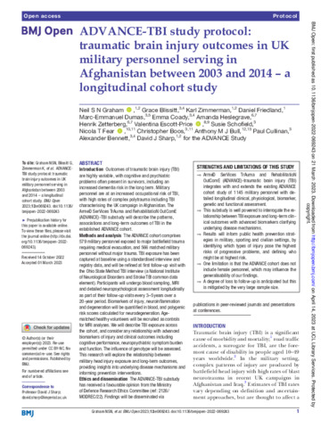 | Title: | ADVANCE-TBI study protocol: traumatic brain injury outcomes in UK military personnel serving in Afghanistan between 2003 and 2014 - a longitudinal cohort study |