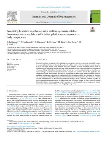 Title: | Combining branched copolymers with additives generates stable thermoresponsive emulsions with in situ gelation upon exposure to body temperature |