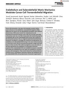 Title: | Endothelium and Subendothelial Matrix Mechanics Modulate Cancer Cell Transendothelial Migration |