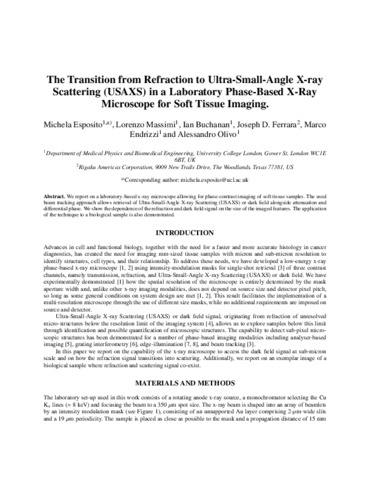 Title: | The transition from refraction to Ultra-Small-Angle X-ray Scattering (USAXS) in a laboratory phase-based X-ray microscope for soft tissue imaging |
