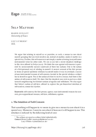We argue that relating to myself as me provides, as such, a reason to care about myself: grasping that an event involves me, instead of another, makes it matter in a special way. Further, this self-concern is not simply a matter of seeing in myself some instrumental value for other ends. We use as our foil a recent skeptical challenge to this view offered in Setiya (2015). We think the case against self-concern is powered by unwarrantedly narrow construals of three key notions. One is the notion of a first-personal way of relating to oneself. A narrow account of the first person in terms of special epistemic relations to oneself makes it easy to overlook a source of non-instrumental reasons of self-concern, located in the special relation a subject has to herself as agent. Two is the notion of what it is to be a reason. And three is the notion of self-concern itself. We show that the skeptical case rests in part on a slide towards neighbouring but distinct notions of egoism and selfishness. We also argue that Setiya’s notion of self-love, offered to capture the pre-theoretical intuition of self-concern, cannot do it justice.