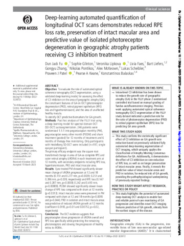 Title: | Deep-learning automated quantification of longitudinal OCT scans demonstrates reduced RPE loss rate, preservation of intact macular area and predictive value of isolated photoreceptor degeneration in geographic atrophy patients receiving C3 inhibition treatment |