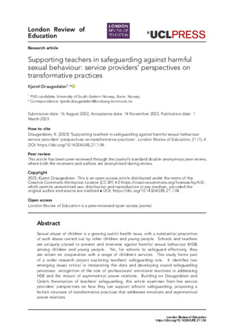 | Title: | Supporting teachers in safeguarding against harmful sexual behaviour: service providers’ perspectives on transformative practices |