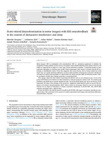 Event-related desynchronization in motor imagery with EEG neurofeedback in the context of declarative interference and sleep.