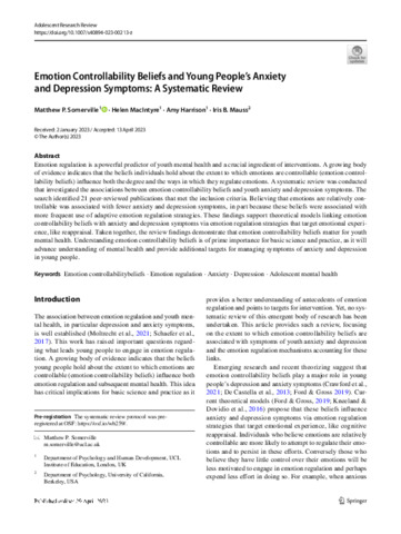 Title: | Emotion Controllability Beliefs and Young People’s Anxiety and Depression Symptoms: A Systematic Review |