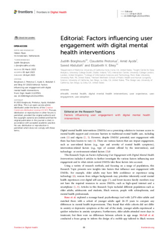 | Title: | Editorial: Factors influencing user engagement with digital mental health interventions |