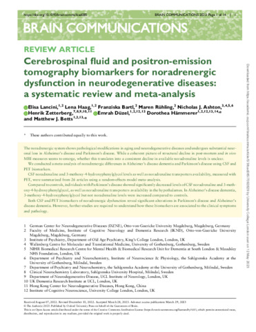 Cerebrospinal fluid and positron-emission tomography biomarkers for noradrenergic dysfunction in neurodegenerative diseases: a systematic review and meta-analysis.