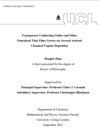 Title: | Transparent conducting oxides and other functional thin films grown via aerosol assisted chemical vapour deposition |