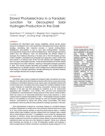 | Title: | Stored photoelectrons in a faradaic junction for decoupled solar hydrogen production in the dark |