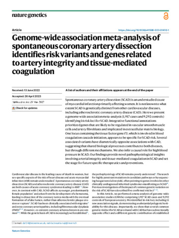 | Title: | Genome-wide association meta-analysis of spontaneous coronary artery dissection identifies risk variants and genes related to artery integrity and tissue-mediated coagulation |