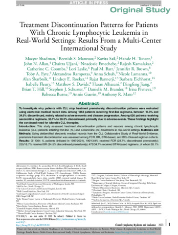 Treatment Discontinuation Patterns for Patients With Chronic Lymphocytic Leukemia in Real-World Settings: Results From a Multi-Center International Study.