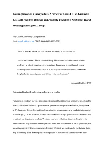 Title: | Housing becomes a family affair: A review of Families, Housing and Property Wealth in a Neoliberal World, By Richard Ronald and Rowan Arundel |