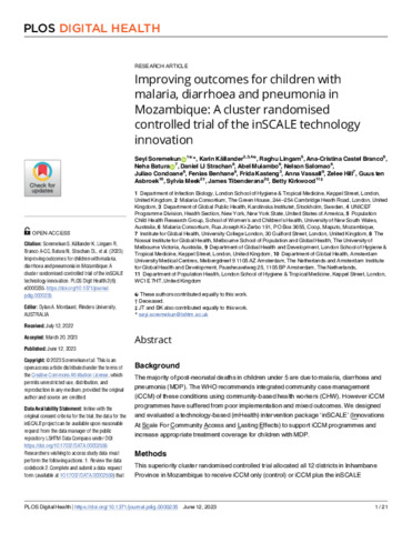 Title: | Improving outcomes for children with malaria, diarrhoea and pneumonia in Mozambique: A cluster randomised controlled trial of the inSCALE technology innovation |