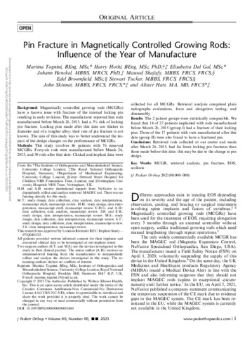 Permissions ORIGINAL ARTICLE Pin Fracture in Magnetically Controlled Growing Rods: Influence of the Year of Manufacture Tognini, Martina BEng, MSc*; Hothi, Harry BEng, MSc, PhD†,‡; Dal Gal, Elisabetta MSc*; Henckel, Johann MBBS, MRCS, PhD‡; Shafafy, Masood MBBS, FRCS, FRCS§; Broomfield, Edel MSc∥; Tucker, Stewart MBBS, FRCS, FRCS∥; Skinner, John MBBS, FRCS, FRCS*,‡; Hart, Alister MA, MD, FRCS*,‡ Author Information Journal of Pediatric Orthopaedics ():10.1097/BPO.0000000000002460, June 19, 2023. | DOI: 10.1097/BPO.0000000000002460 OPEN PAP Metrics Abstract Background: Magnetically controlled growing rods (MCGRs) have a known issue with fracture of the internal locking pin resulting in early revisions. The manufacturer reported that rods manufactured before March 26, 2015, had a 5% risk of locking pin fracture. Locking pins made after this date are thicker in diameter and of a tougher alloy; their rate of pin fracture is not known. The aim of this study was to better understand the impact of the design changes on the performance of MCGRs. Methods: This study involves 46 patients with 76 removed MCGRs. Forty-six rods were manufactured before March 26, 2015, and 30 rods after that date. Clinical and implant data were collected for all MCGRs. Retrieval analysis comprised plain radiographs evaluations, force and elongation testing, and disassembly. Results: The 2 patient groups were statistically comparable. We found that 14 of 27 patients implanted with rods manufactured before March 26, 2015 (group I) had a fracture of their locking pins. Three of the 17 patients with rods manufactured after this date (group II) were also found to have a fractured pin. Conclusions: Retrieved rods collected at our center and made after March 26, 2015, had far fewer locking pin fractures than those made before this date; this may be due to the change in pin design.
