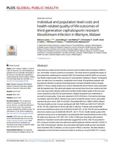 Title: | Individual and population level costs and health-related quality of life outcomes of third-generation cephalosporin resistant bloodstream infection in Blantyre, Malawi |