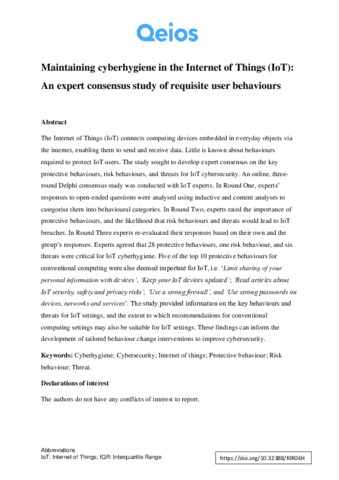 Title: | Maintaining cyberhygiene in the Internet of Things (IoT): An expert consensus study of requisite user behaviours |
