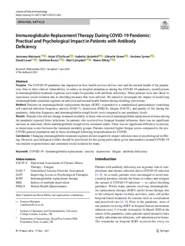 | Title: | Immunoglobulin Replacement Therapy During COVID-19 Pandemic: Practical and Psychological Impact in Patients with Antibody Deficiency |