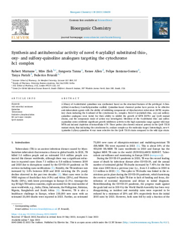 Title: | Synthesis and antitubercular activity of novel 4-arylalkyl substituted thio-, oxy- and sulfoxy-quinoline analogues targeting the cytochrome bc1 complex |