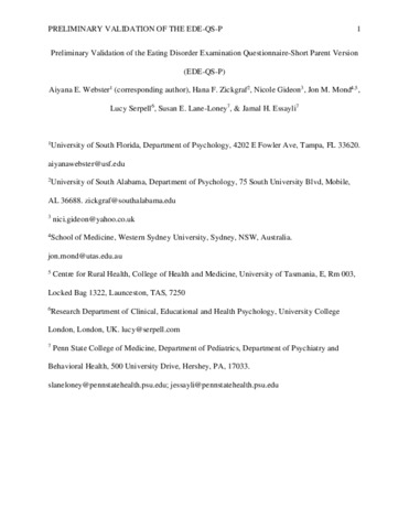 Preliminary Validation of The Eating Disorders Examination Questionnaire-Short Parent Version (EDE-QS-P).