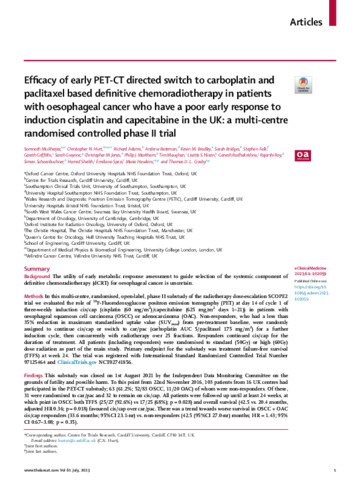 Efficacy of early PET-CT directed switch to carboplatin and paclitaxel based definitive chemoradiotherapy in patients with oesophageal cancer who have a poor early response to induction cisplatin and capecitabine in the UK: a multi-centre randomised controlled phase II trial induction cisplatin and capecitabine in the UK: a multi-centre randomised controlled phase II trial.