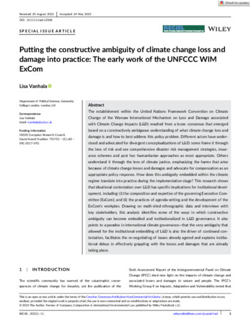 Title: | Putting the constructive ambiguity of climate change loss and damage into practice: The early work of the UNFCCC WIM ExCom |