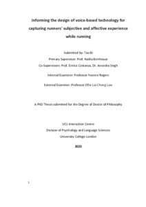 Tao Bi_PhD Thesis_Informing the design of voice-based technology for capturing runners' subjective and affective experience while running.pdf - Accepted Version Download (9MB) | Preview |