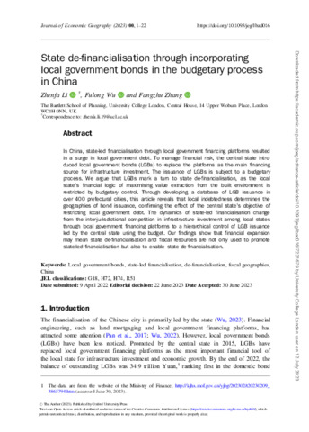Title: | State de-financialisation through incorporating local government bonds in the budgetary process in China |