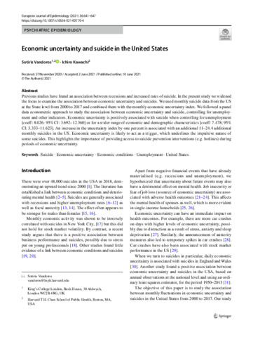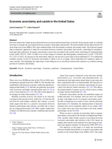 Previous studies have found an association between recessions and increased rates of suicide. In the present study we widened the focus to examine the association between economic uncertainty and suicides. We used monthly suicide data from the US at the State level from 2000 to 2017 and combined them with the monthly economic uncertainty index. We followed a panel data econometric approach to study the association between economic uncertainty and suicide, controlling for unemployment and other indicators. Economic uncertainty is positively associated with suicide when controlling for unemployment [coeff: 8.026; 95% CI: 3.692–12.360] or for a wider range of economic and demographic characteristics [coeff: 7.478; 95% CI: 3.333–11.623]. An increase in the uncertainty index by one percent is associated with an additional 11–24.4 additional monthly suicides in the US. Economic uncertainty is likely to act as a trigger, which underlines the impulsive nature of some suicides. This highlights the importance of providing access to suicide prevention interventions (e.g. hotlines) during periods of economic uncertainty.