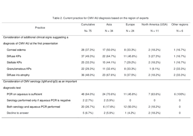 AIMS: To present current practice patterns in the diagnosis and management of Cytomegalovirus anterior uveitis (CMV AU) by uveitis experts worldwide. METHODS: A two-round modified Delphi survey with masking of the study team was performed. Based on experience and expertise, 100 international uveitis specialists from 21 countries were invited to participate in the survey. Variation in the diagnostic approaches and preferred management of CMV AU was captured using an online survey platform. RESULTS: Seventy-five experts completed both surveys. Fifty-five of the 75 experts (73.3%) would always perform diagnostic aqueous tap in suspected CMV AU cases. Consensus was achieved for starting topical antiviral treatment (85% of experts). About half of the experts (48%) would only commence systemic antiviral treatment for severe, prolonged, or atypical presentation. The preferred specific route was ganciclovir gel 0.15% for topical treatment (selected by 70% of experts) and oral valganciclovir for systemic treatment (78% of experts). The majority of experts (77%) would commence treatment with topical corticosteroid four times daily for one to two weeks along with antiviral coverage, with subsequent adjustment depending on the clinical response. Prednisolone acetate 1% was the drug of choice (opted by 70% of experts). Long-term maintenance treatment (up to 12 months) can be considered for chronic course of inflammation (88% of experts) and those with at least 2 episodes of CMV AU within a year (75-88% of experts). CONCLUSIONS: Preferred management practices for CMV AU vary widely. Further research is necessary to refine diagnosis and management and provide higher-level evidence.
