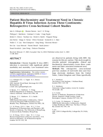 INTRODUCTION: Chronic hepatitis B virus (HBV) infection is associated with significant global morbidity and mortality. Low treatment rates are observed in patients living with HBV; the reasons for this are unclear. This study sought to describe patients' demographic, clinical and biochemical characteristics across three continents and their associated treatment need. METHODS: This retrospective cross-sectional post hoc analysis of real-world data used four large electronic databases from the United States, United Kingdom and China (specifically Hong Kong and Fuzhou). Patients were identified by first evidence of chronic HBV infection in a given year (their index date) and characterized. An algorithm was designed and applied, wherein patients were categorized as treated, untreated but indicated for treatment and untreated and not indicated for treatment based on treatment status and demographic, clinical, biochemical and virological characteristics (age; evidence of fibrosis/cirrhosis; alanine aminotransferase [ALT] levels, HCV/HIV coinfection and HBV virology markers). RESULTS: In total, 12,614 US patients, 503 UK patients, 34,135 patients from Hong Kong and 21,614 from Fuzhou were included. Adults (99.4%) and males (59.0%) predominated. Overall, 34.5% of patients were treated at index (range 15.9-49.6%), with nucleos(t)ide analogue monotherapy most commonly prescribed. The proportion of untreated-but-indicated patients ranged from 12.9% in Hong Kong to 18.2% in the UK; almost two-thirds of these patients (range 61.3-66.7%) had evidence of fibrosis/cirrhosis. A quarter (25.3%) of untreated-but-indicated patients were aged ≥ 65 years. CONCLUSION: This large real-world dataset demonstrates that chronic hepatitis B infection remains a global health concern; despite the availability of effective suppressive therapy, a considerable proportion of predominantly adult patients apparently indicated for treatment are currently untreated, including many patients with fibrosis/cirrhosis. Causes of disparity in treatment status warrant further investigation.