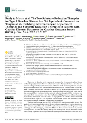 Reply to Mistry et al. The Two Substrate Reduction Therapies for Type 1 Gaucher Disease Are Not Equivalent. Comment on “Hughes et al. Switching between Enzyme Replacement Therapies and Substrate Reduction Therapies in Patients with Gaucher Disease: Data from the Gaucher Outcome Survey (GOS). J. Clin. Med. 2022, 11, 5158”.