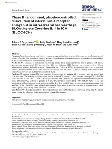 | Title: | Phase II randomised, placebo-controlled, clinical trial of interleukin-1 receptor antagonist in intracerebral haemorrhage: BLOcking the Cytokine IL-1 in ICH (BLOC-ICH) |