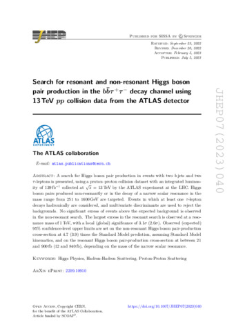 Title: | Search for resonant and non-resonant Higgs boson pair production in the bb¯¯τ⁺τ⁻ decay channel using 13 TeV pp collision data from the ATLAS detector |