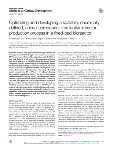 | Title: | Optimizing and developing a scalable, chemically defined, animal component-free lentiviral vector production process in a fixed-bed bioreactor |