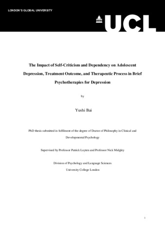 Title: | The Impact of Self-Criticism and Dependency on Adolescent Depression, Treatment Outcome, and Therapeutic Process in Brief Psychotherapies for Depression |